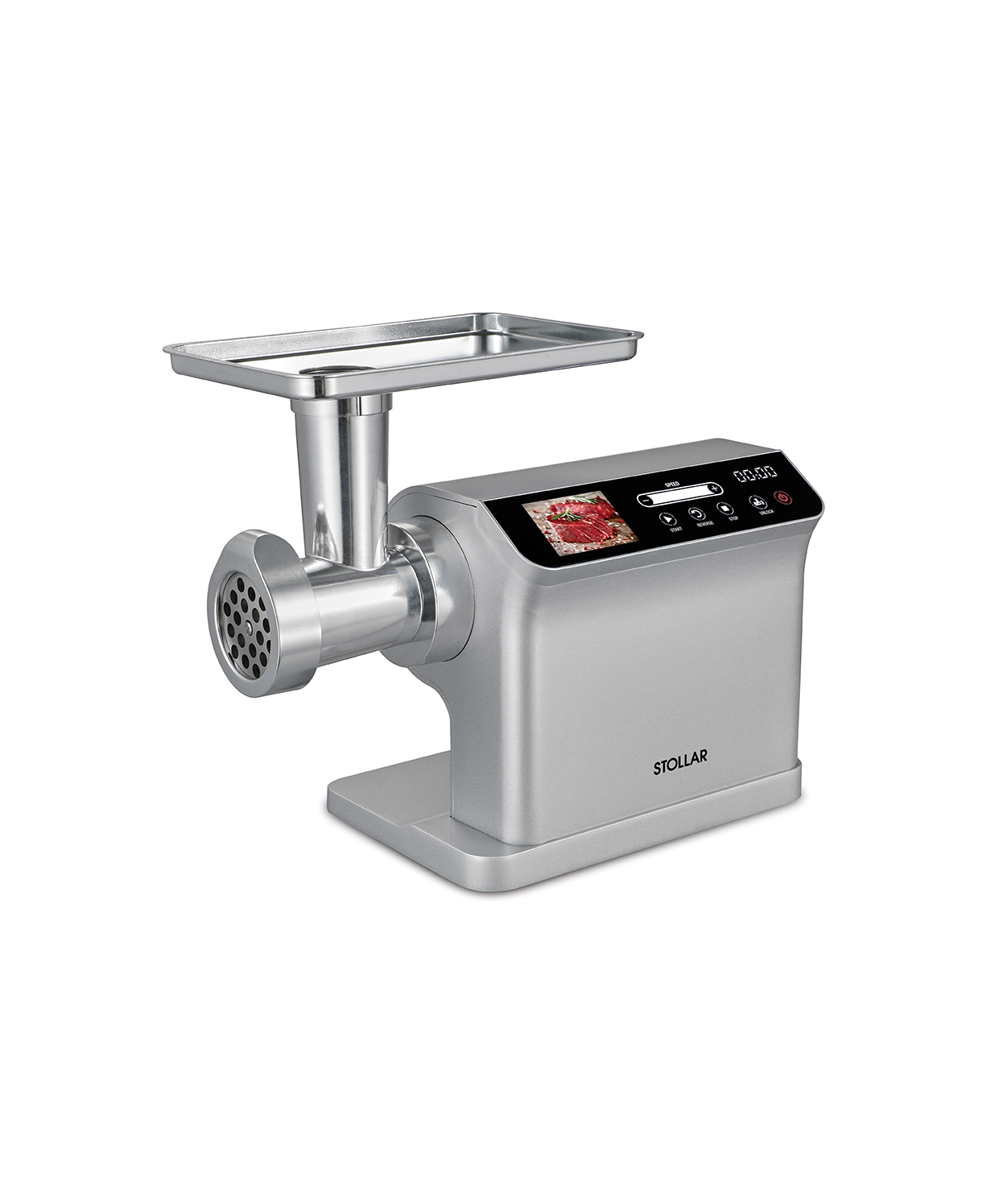 Powerful 2500W variable speed meat grinder with durable metal linker. Touchscreen control panel and interactive LCD display.