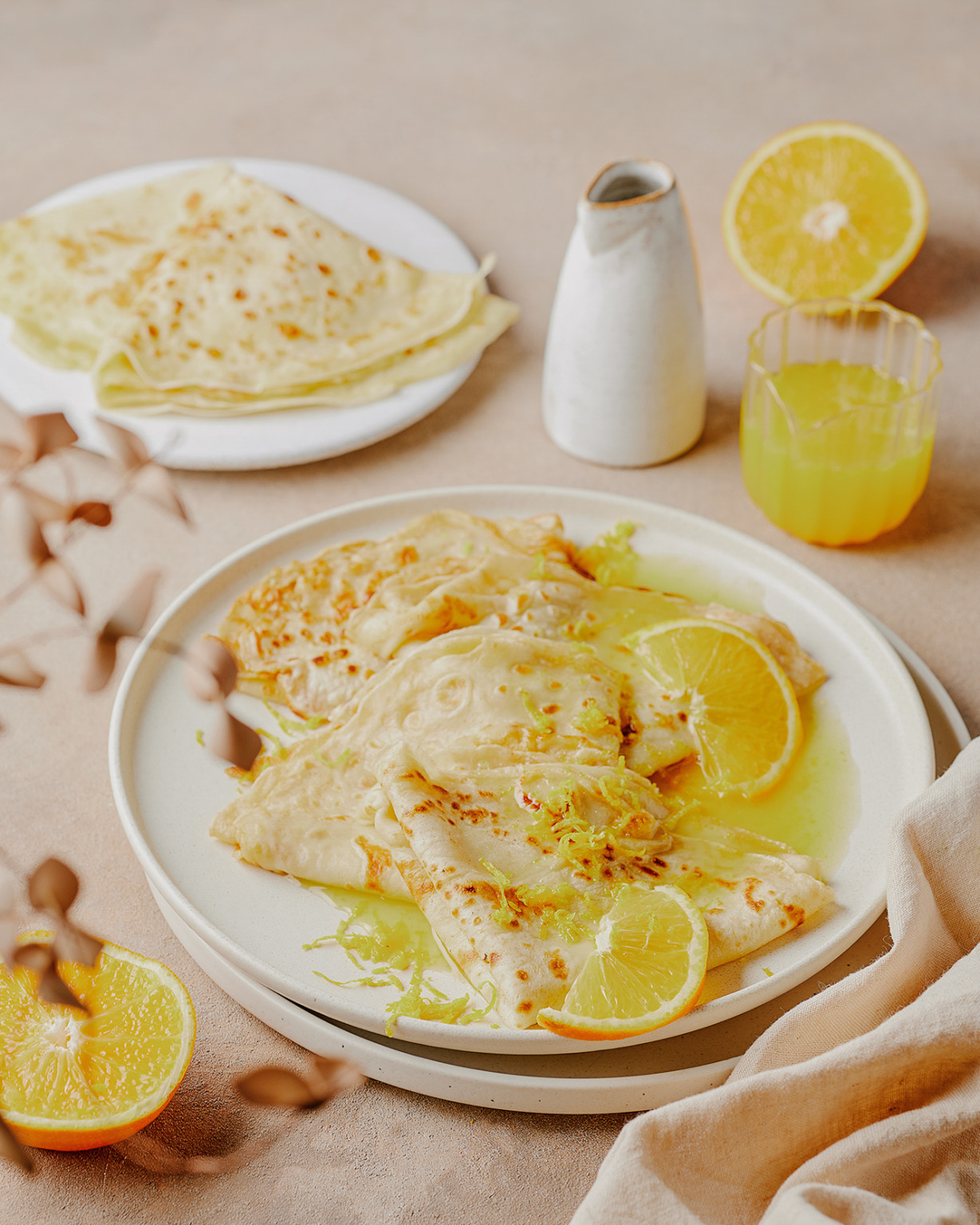 - Arc the crepes into triangles and serve with butter and orange sauce.